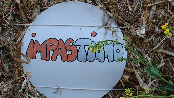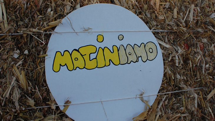 Lo spazio SAR.PA. sembrava il padiglione di una vecchia fiera campestre: la giostra al centro coi cavallini di copertone, gli spazi dedicati alle varie fasi del ciclo del grano delimitati da balle di fieno, gli asini e le galline di Alessandro, i tappetini per lo yoga di MataBuh! e i libri della biblioteca di Milis.