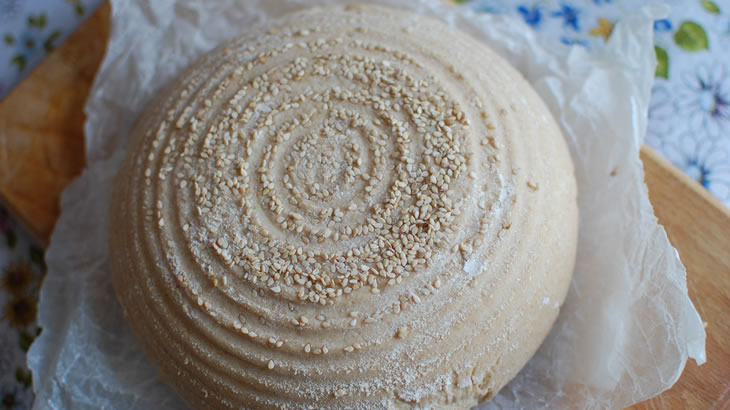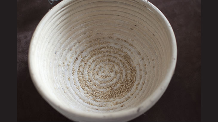 Spolverare il cestino da lievitazione di farina. È possibile aggiungere del sesamo o altri semi a piacere. Rovesciare l’impasto nel cestino. Coprire con pellicola (sempre senza PVC) e il solito panno umido, mettere in una busta per alimenti.